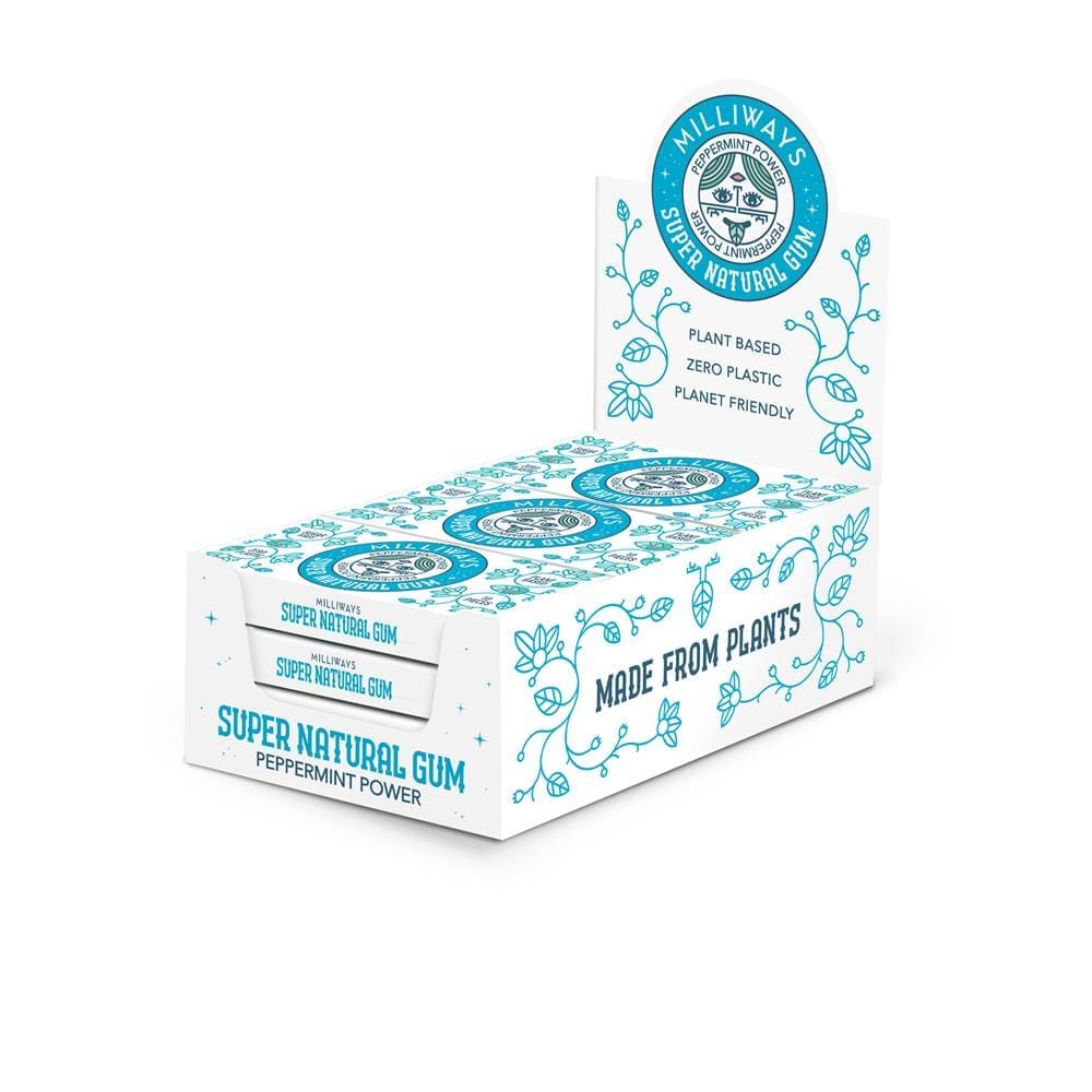 Milliways Super Natural Gum is plastic-free, plant-based, sugar-free and biodegradable chewing gum. Unlike conventional chewing gum which is made from chewy plastic and never decomposes, Milliways is 100% plastic-free from our gum to our packaging, meaning it biodegrades like a piece of fruit. Our Super Natural Gum is also vegan, aspartame-free, completely sustainable, HFSS compliant and keeps teeth healthy. We naturally source the highest quality plant-based ingredients to create a delicious chewing gum that bursts with flavour. We’ve combined the natural flavours of Mentha Peperita and Mentha Arvensis to give you a cooler than cool, ice cold, peppermint chewing gum, freshening your mouth up like an arctic breeze